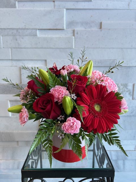 This arrangement is truly too cute! Designed in a striped glass pot, this piece includes red Gerbera Daisies, red Roses, Lilies, Commercial Mums and Mini Carnations. A perfect gift for the one you love!